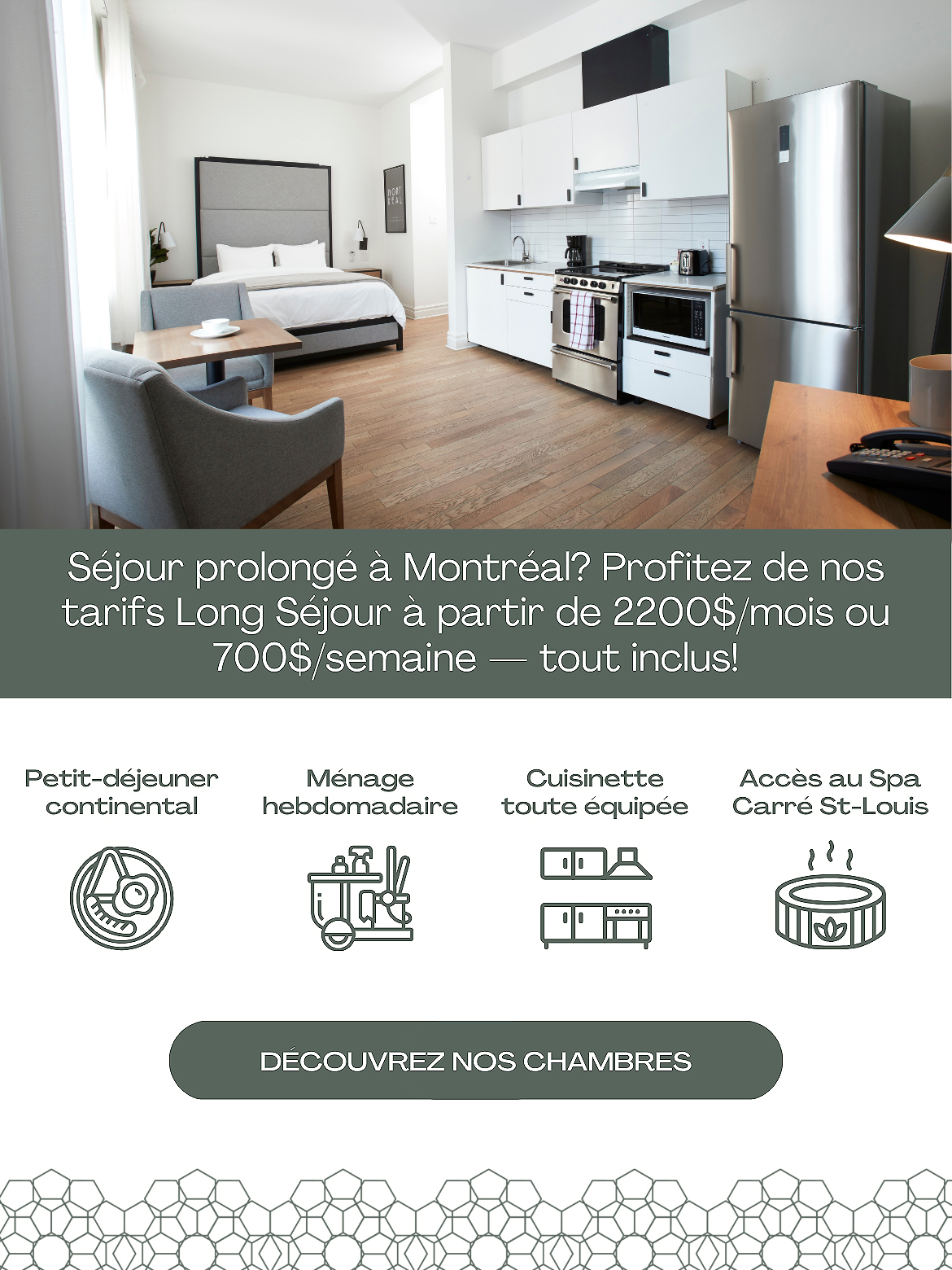 Pensées pour allier charme, confort et tranquillité, les chambres de l’Hôtel Spa Carré St-Louis vous offrent un véritable havre de paix au cœur de Montréal. Et pour les séjours de longue durée, profitez d'aménagements fonctionnels tels que cuisinette, salon, espace repas et/ou espace travail. Chaque détail a été soigneusement conçu pour faire de votre séjour une expérience aussi agréable qu’inoubliable.